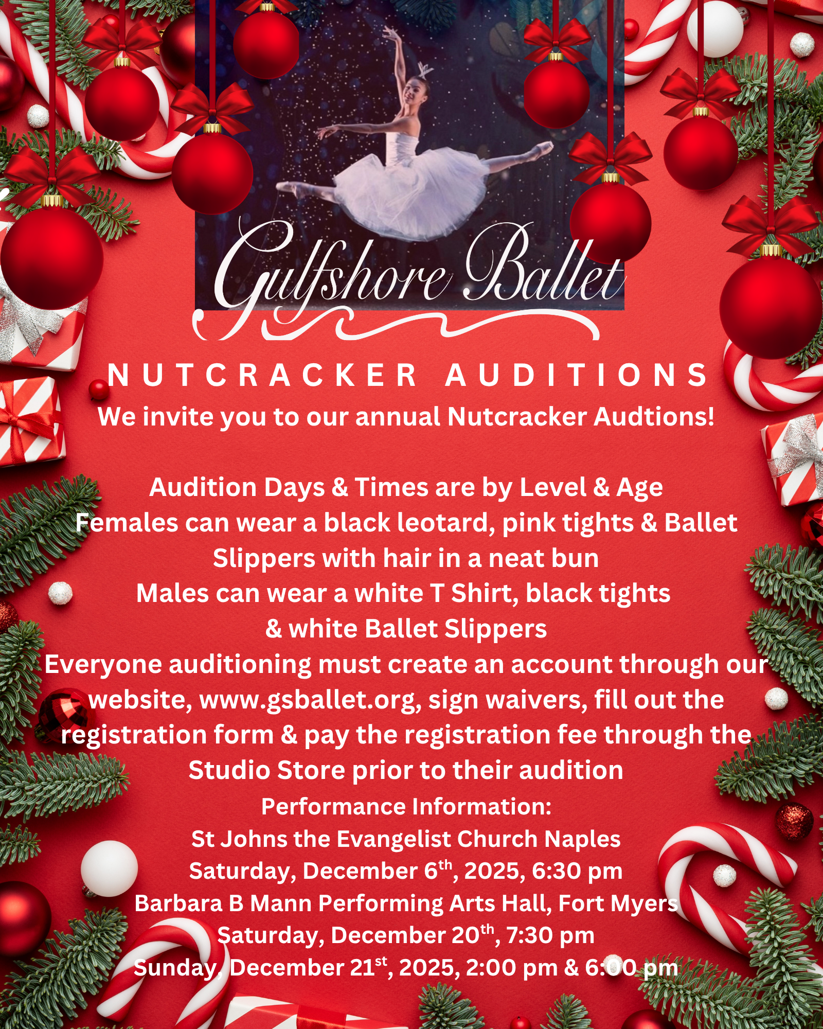 Gulfshore Ballet invites Non GSB Students to audition for our annual production of the Nutcracker.